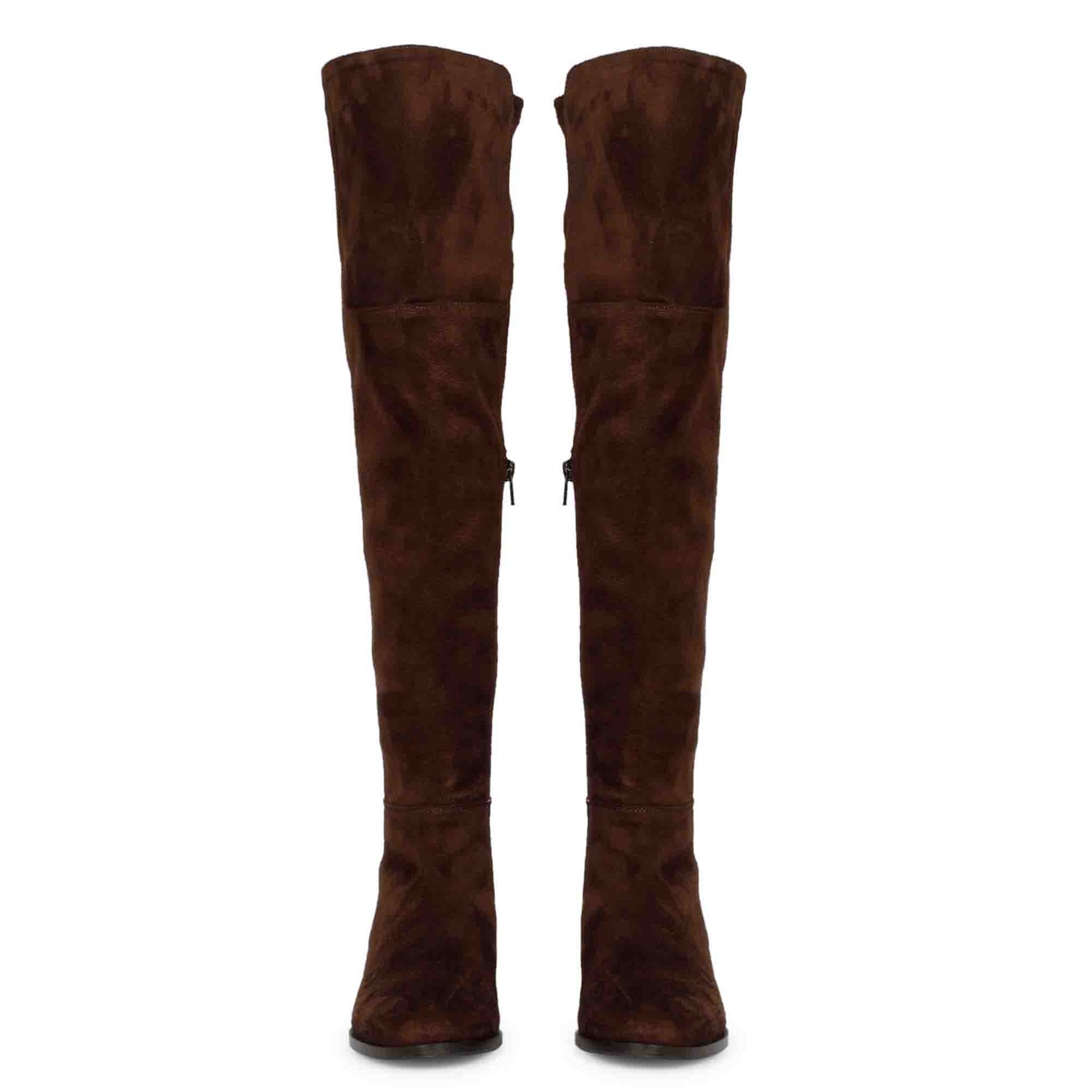 Complete your edgy style with these brown stretch suede above the knee riding boots. Featured thigh high, stitching details, paneled finish with a round toe and low heel. inside zipper closure for easy on/off. Finished with leather insole and leather lining.