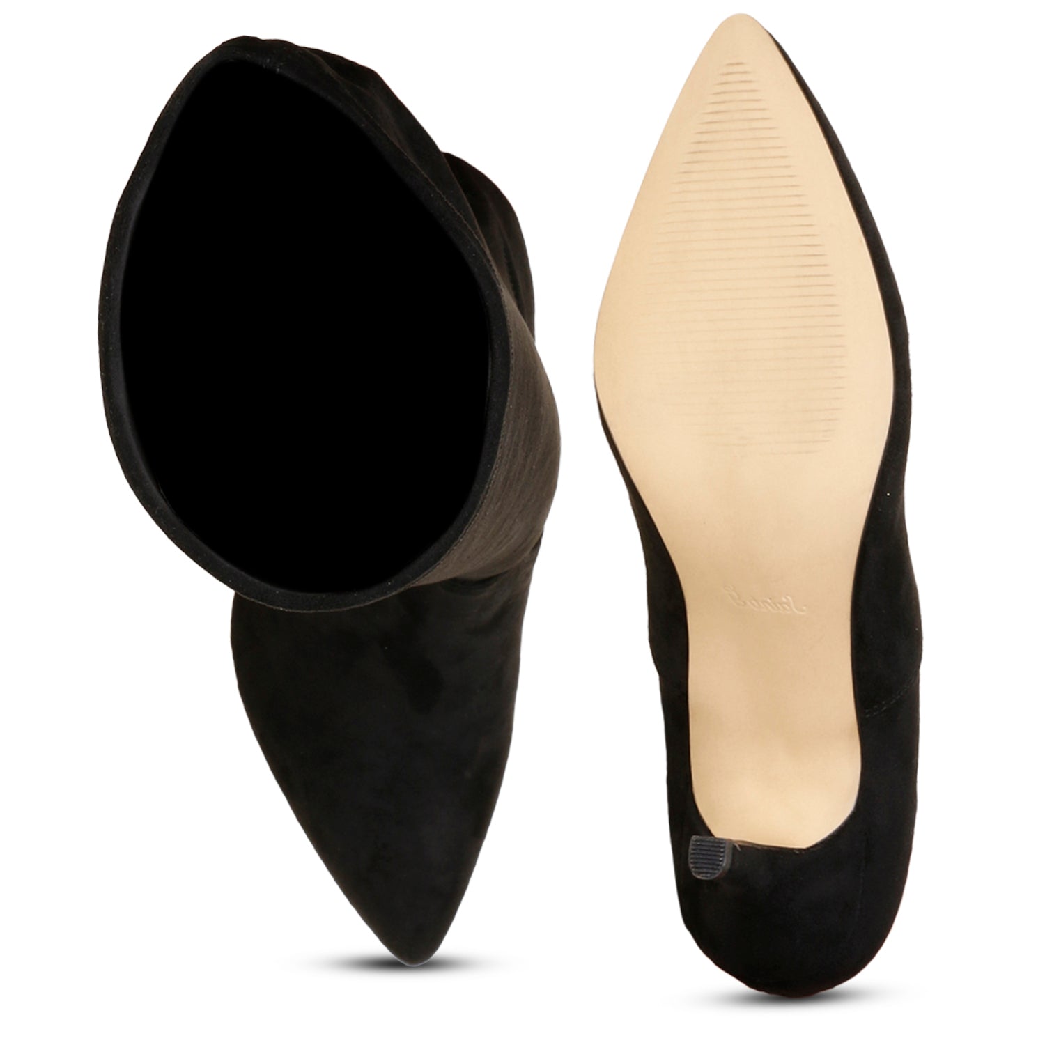 The Saint Jemima black stretch suede knee high boot is a luxury that cleverly combines a stylish youthful outlook. These knee high boots have a black stretch suede upper and a pointed toe to add a touch of style to your everyday look. Made from the finest materials and finished with trending design details. Features a covered stiletto heel, stitching details with paneled finish. complete with leather lining, padded leather footbed with stamped logo and tunit sole.