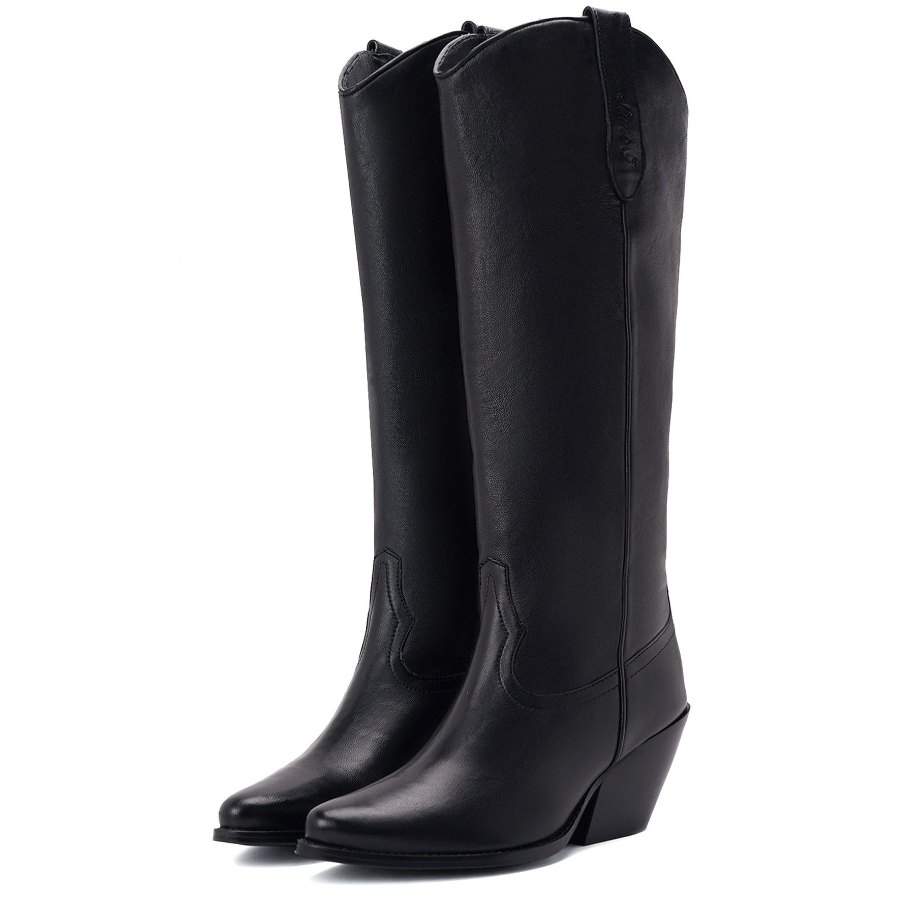A pair of Saint Loanna black leather cowboy long boot features stitching details with paneled finish, a pointed toe, low block heel and leather loop both side on top. Complete with leather and fabric lining, padded leather footbed and tunit sole. A stacked heel makes this boot a stylish choice for any occasion. One of the most prominent patterns on this season. These top-notch leather boots by SaintG will keep you looking stylish all year long. Easy to pair with your most favorite dress for a chic look, will bring a touch of elegance everywhere you go. The approx. height of the boot is- 48.26 cm (19 Inches).