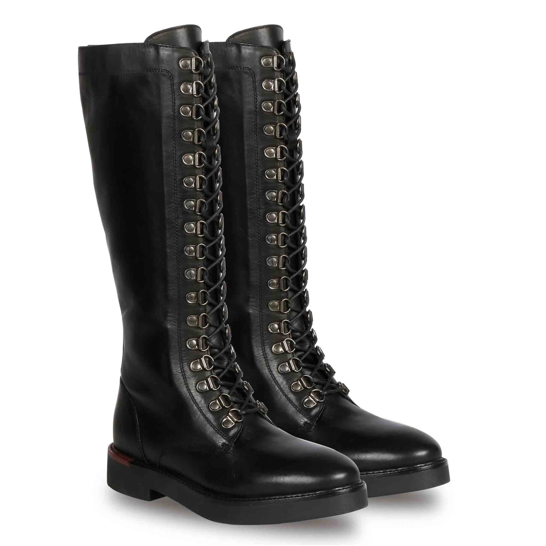 Meet Saint Mercello black leather handcrafted long boots, the new classic. These boots are sure to turn heads. Featuring high tongue lace-up front and red welted low block heels. fleece and soft leather lining for a luxurious feel, padded leather insole provides lasting comfort. The inside zip closure boot sit on a TPR sole. Designed in Milan.