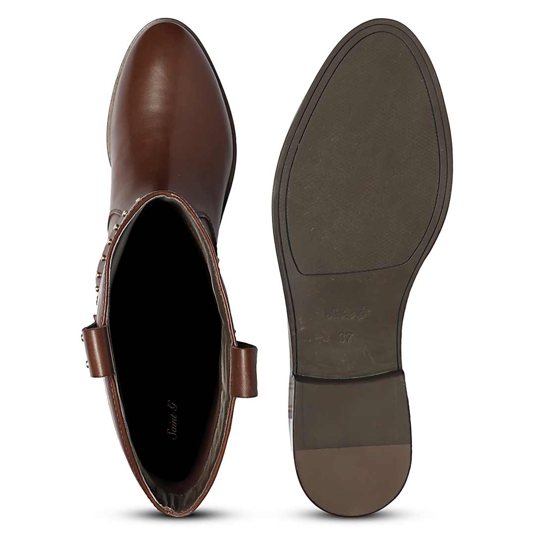 Marcelle reimagines the riding boot in smooth brown leather, detailed with micro studs and a polished buckle strap. The tall shaft and pull tab nod to equestrian roots, while the clean lines and refined finish anchor it in modern wardrobe essentials.