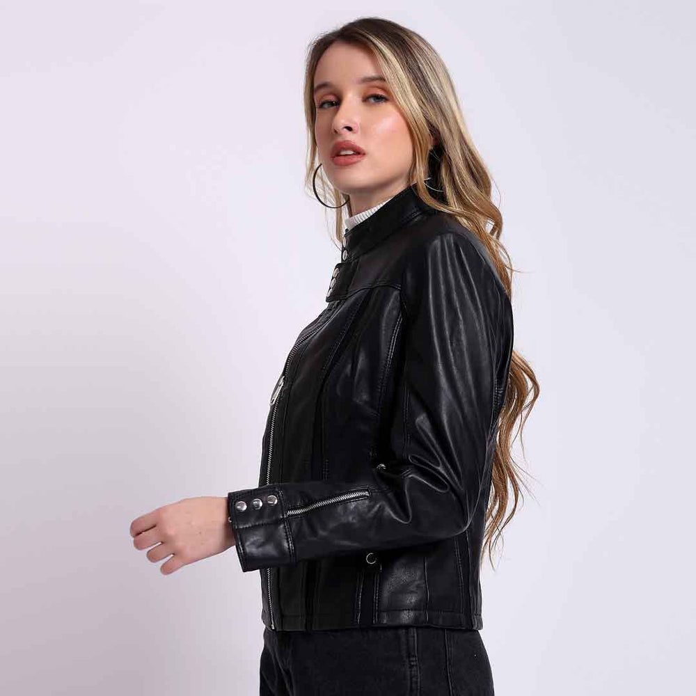 Saint Amaya, a 100% black genuine leather handcrafted into an outer shell creates an impressive look that will make heads turn! Inside, printed silk stain sewn with precision envelops you in comfort. A zipper closure and snap collar with buttons offer easy, adjustable wear, while open hem zipped cuffs give a modern feel. Two functional button pockets and a pocket inside add practicality.