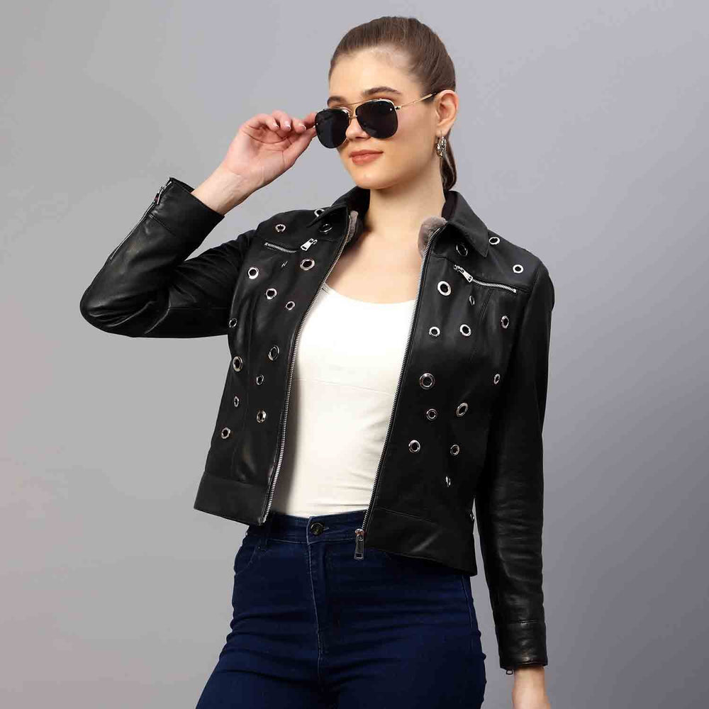 Elevate your style with the Saintg willow Black Leather Jacket – a perfect blend of edgy design and comfort. The jacket features eye-catching large-sized eyelets that create a distinctive pattern, adding a bold touch to its timeless black leather exterior. Versatile for various occasions, this piece is a contemporary wardrobe essential.