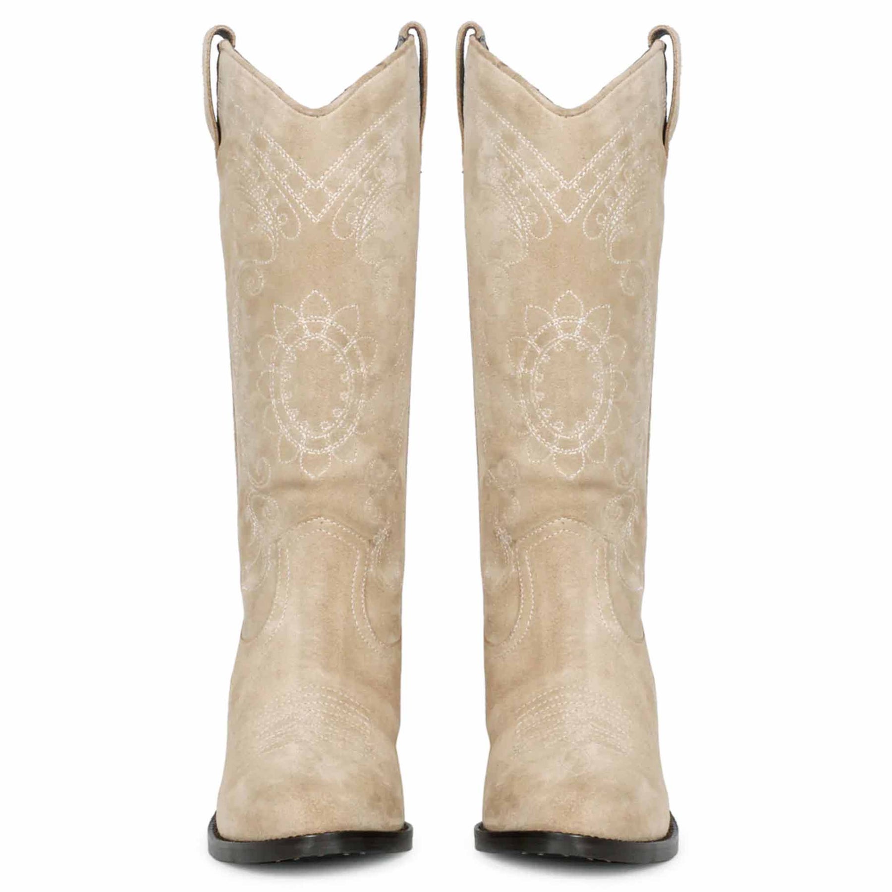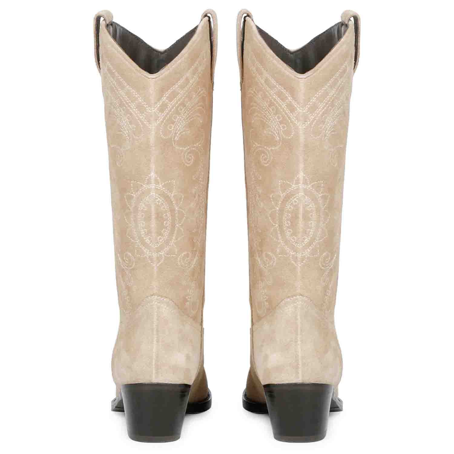Saint Elodie, a ivory calf length cowboy boot with full stitched leather upper with both side leather pull tabs and leather sole. One of the most prominent patterns on this season.