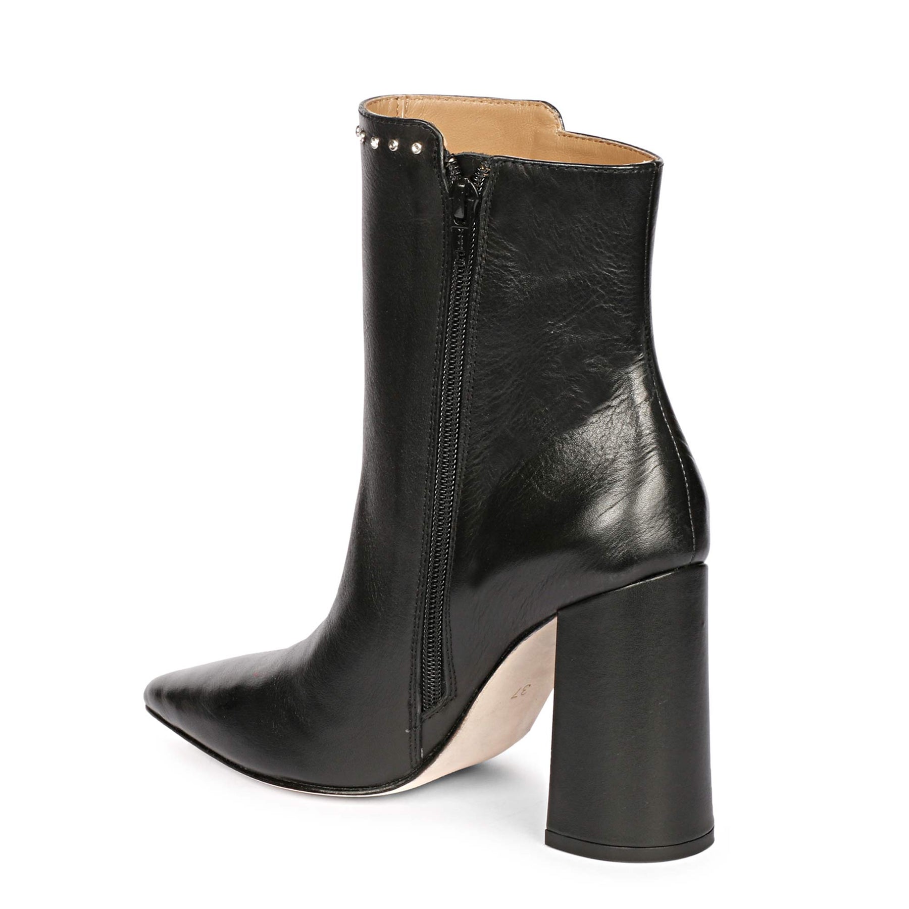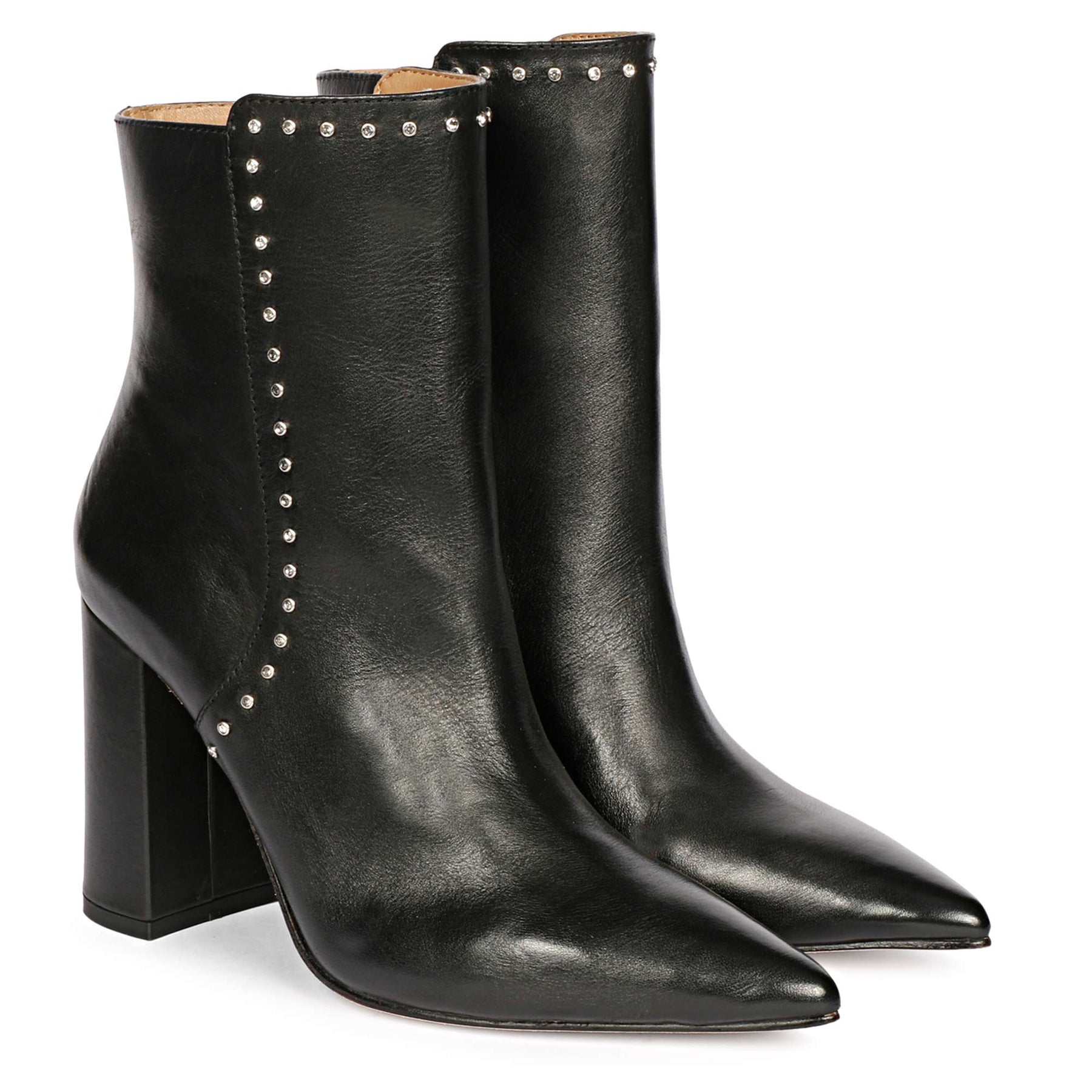 Walk a little taller in these beautiful Fia studs embellished ankle boots. These pointed boots are the perfect way to add a glamorous look to your everyday styling. Featuring studded crust leather upper, leather sole and inside zip closure to ensure comfortably slip them on and off. Completed with leather lining and padded leather footbed. The slip on boot sit on leather covered block heel.