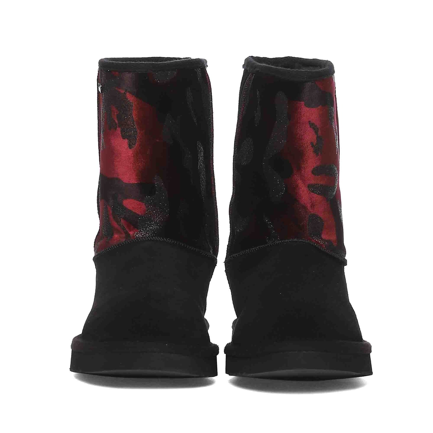 The dazzling, black suede leather and burgundy camo fabric snug boot will instantly give your winter look a fun party vibe. These boots are designed with fur lining and fur insole to keep your feet warm while you have fun. Enjoy your step with super comfortable & flexible rubber sole.