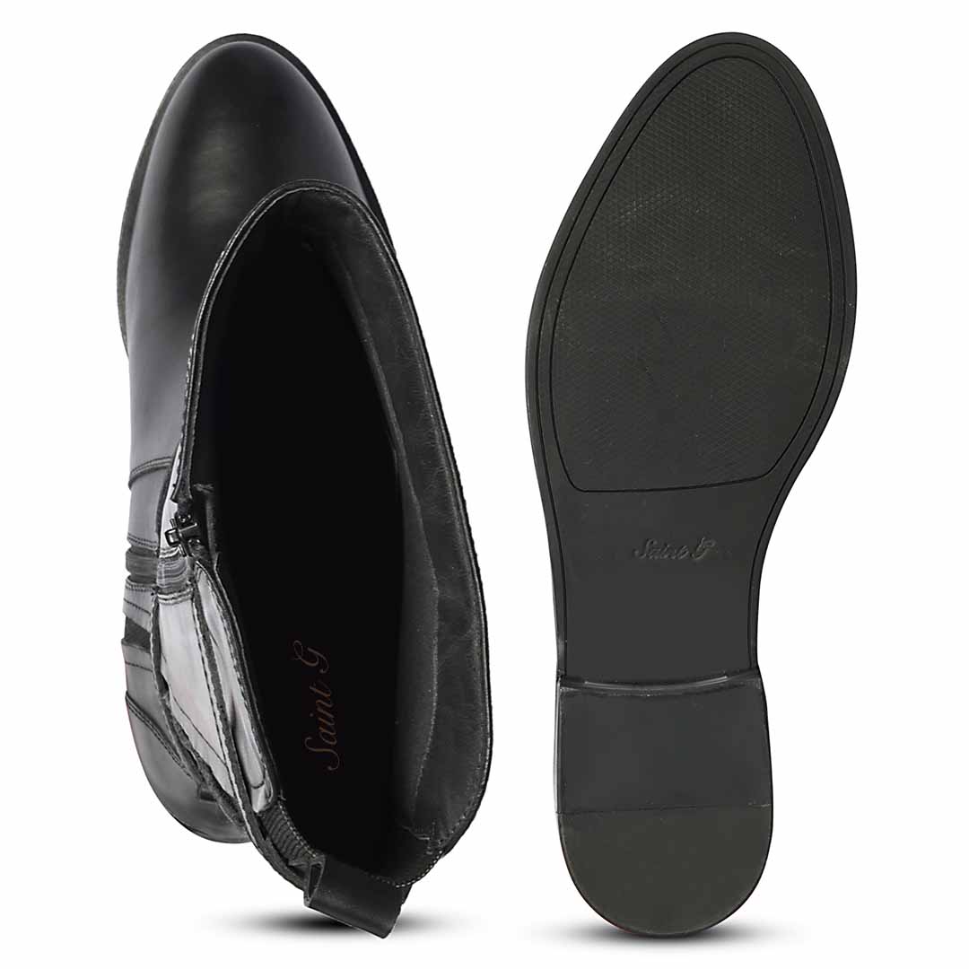 An iconic pair of knee-high boots, meticulously handcrafted in rich black genuine leather, cut to a sleek equestrian line. Gold-toned buckles and contrast elastic trace the leg, with a concealed side zip for ease. A low stacked heel balances refinement with everyday wearability, it’s a statement piece that transcends seasons.
