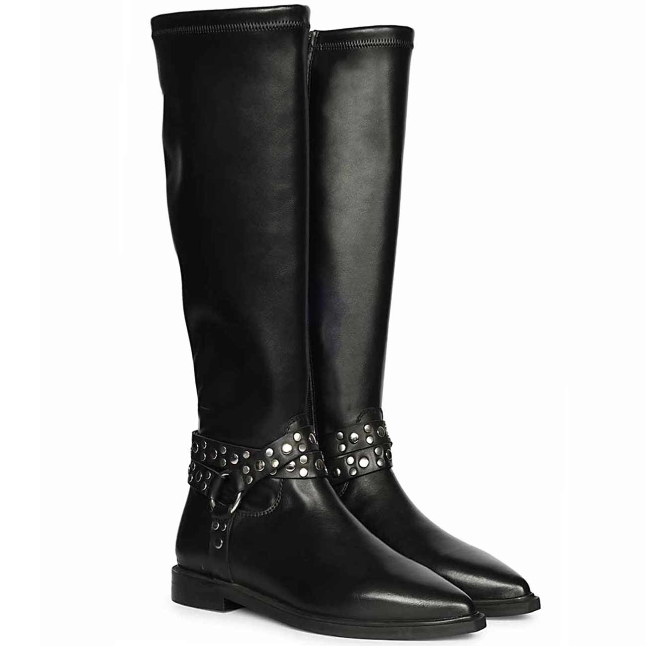 Commanding yet refined, these tall boots fuse smooth crust leather with a sleek stretch napa shaft for a sculpted fit. A studded harness strap with metallic rings lends an edgy equestrian twist, while the skin-fit fabric and soft leather lining ensure all-day comfort. Set on a durable tunit sole. Versatile enough to stride through city streets or elevate after-dark looks.